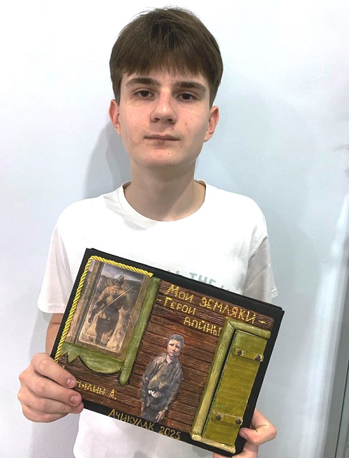 Читатель Ачикулакской детской библиотеки Алексей Бутылин и заведующая Ачикулакской детской библиотекой Надежда Николаевна Гришина награждены благодарственными письмами за участие в краевом конкурсе рукотворной книги «“Солдаты” в бумажных шинелях», посвященном 80-й годовщине Победы в Великой Отечественной войне и Году защитника Отечества. Конкурс организован Ставропольской краевой универсальной научной библиотекой им. М. Ю. Лермонтова. На конкурс была подготовлена книга «Мои земляки – Герои войны», изготовленная своими руками. В проделанной большой работе Алексея поддержала мама, вместе они творчески подошли к оформлению обложки книги. В тексте был использован материал о земляках - участниках Великой Отечественной войны из архива Ачикулакской детской библиотеки.